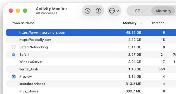 Dans la capture d'écran présentée ici, nous pouvons voir que deux onglets Safari laissés pendant la nuit ont atteint d'énormes tailles de mémoire, plus que ce que le Mac a avec la RAM physique. Au réveil du Mac, l'ordinateur était presque inutilisablement lent, et la suppression de ces deux processus Safari errants a résolu le problème (bien que laisser les onglets ouverts semble longtemps semble recréer le problème rapidement).
