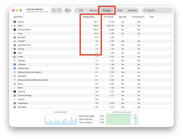 Vous pouvez utiliser Activity Monitor pour suivre les applications et les processus qui consomment beaucoup d'énergie, réduisant ainsi la durée de vie de votre batterie.