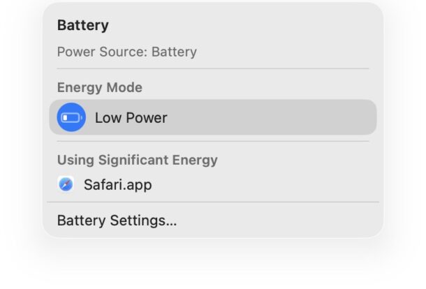 Vous pouvez généralement économiser environ une heure supplémentaire sur la batterie de votre MacBook Pro ou MacBook Air en activant le « Mode faible consommation », une fonctionnalité qui réduit la consommation d'énergie (et les performances) du Mac lorsqu'il est activé, afin de prolonger la durée de vie de la batterie.