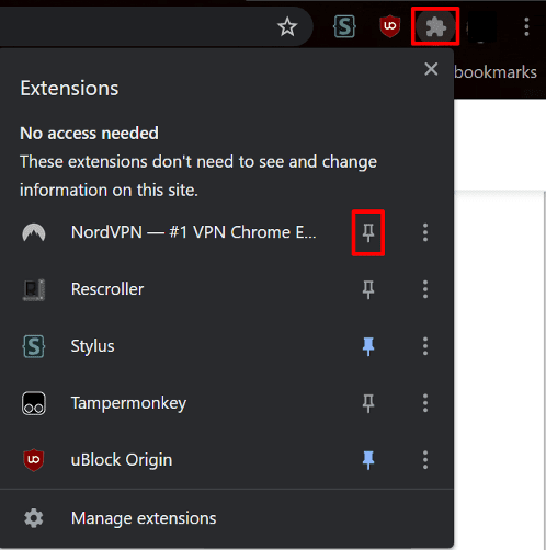 Étape 9 :Si vous ne voyez pas l'icône NordVPN, sélectionnez lepièce de puzzleà l'extrême droite de votre menu. Sélectionnez ensuite leépingle icône,donc il devient bleu.
