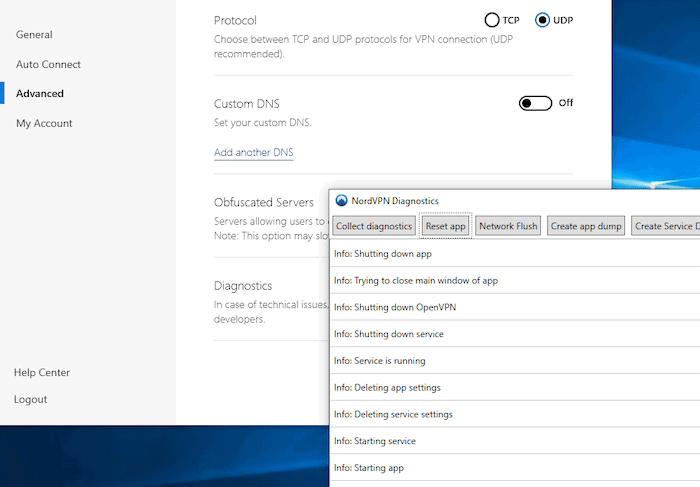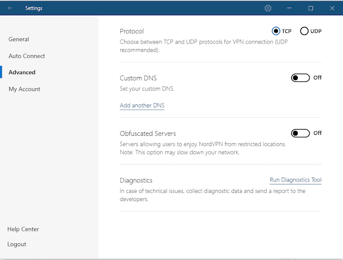 DansParamètres avancéssur le client VPN, vous verrez un bouton qui dit «Exécuter l'outil de diagnostic". Lorsqu'un logiciel rencontre des problèmes, vous exécutez généralement une vérification de diagnostic pour éventuellement localiser l'erreur.