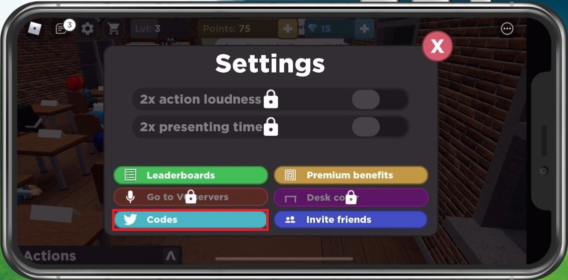 Sur votre appareil mobile, vous pouvez suivre les mêmes étapes. Appuyez sur l'icône des paramètres en haut à gauche de votre écran et sélectionnezCodespour entrer des codes et obtenir des articles gratuits.