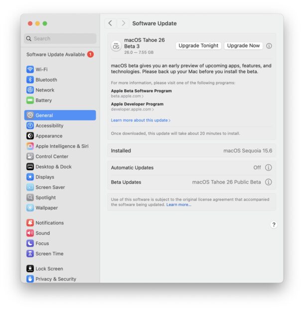 - Sélectionnez pour mettre à jour maintenant pour MacOS Tahoe 26 Public Beta 3