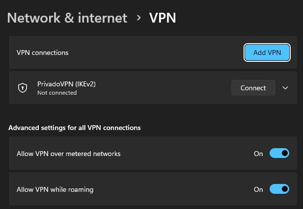Ensuite, ouvrez vos paramètres Windows. SousRéseau & Internet, cliquez surVPNet assurez-vous que votre connexion VPN est désactivée. Un VPN peut être très utile, mais il peut également provoquer des erreurs réseau avec Roblox. Si vous recherchez une connexion VPN fiable, nous vous recommandonsVPN Privé.