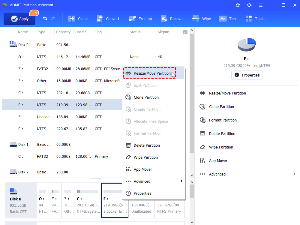 Étape 1. Sélectionnez une partition voisine de la partition BitLocker et choisissez « Redimensionner/Déplacer la partition ».
