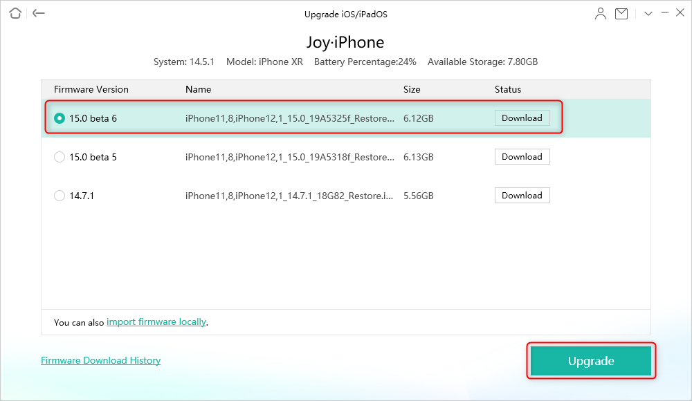 Étape 3 :Téléchargez le fichier système iOS approprié. Ensuite, cliquez surMise à niveaupour mettre à jour l'iPhone.