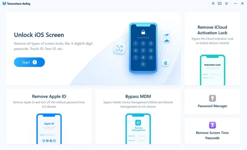 | Tenorshare 4uKey | Verrouillages d'écran, verrouillages MDM, code d'accès Screen Time, Identifiant Apple | Haut | ⭐⭐⭐⭐ | En savoir plus |
