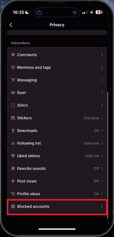 Paramètres de confidentialité TikTok > Comptes bloqués
