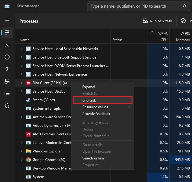 Différentes raisons peuvent provoquer le problème de lancement de Valorant. Tout d’abord, vous devez mettre fin à tous les processus Riot Games, Valorant et Vanguard dans votreGestionnaire de tâches. Cliquez avec le bouton droit sur le processus Riot Games dans leProcessussection et sélectionnezFin de tâche. Il serait utile d’empêcher également l’exécution d’applications gourmandes en ressources lorsque vous essayez de lancer Valorant.