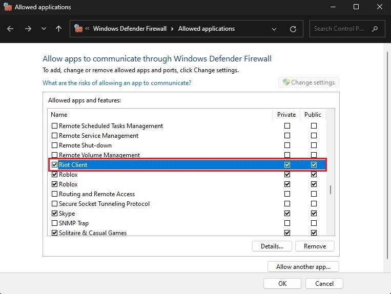 S'il n'apparaît pas dans cette liste, cliquez surAutoriser une autre application… et puisParcourir, ce qui ouvrira votre explorateur de fichiers. Accédez au lecteur sur lequel vous enregistrez Riot Games, Riot Games, Riot Client, et sélectionnez ici leRiotClientServicesapplication. Assurez-vous que ces deux cases sont cochées avant de fermer cette fenêtre.