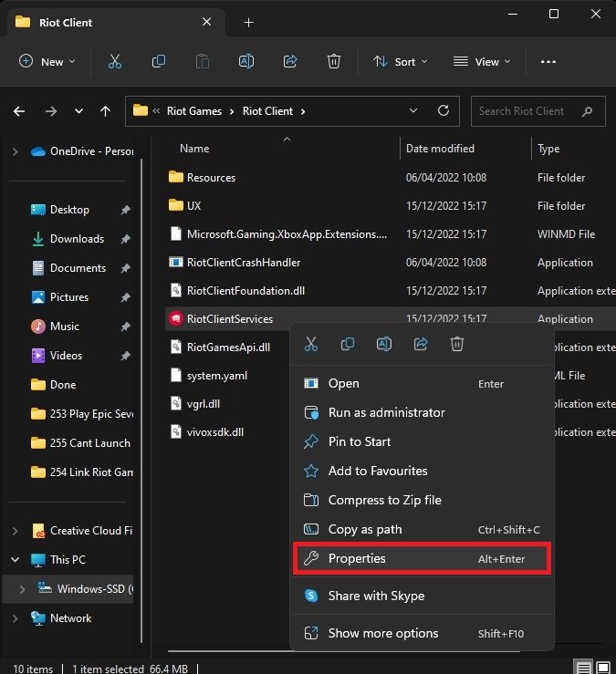 Votre explorateur de fichiers s'ouvrira. Cliquez avec le bouton droit sur le raccourci Riot Games et sélectionnezEmplacement du fichier ouvertencore. Dans votre explorateur de fichiers, accédez à Riot Games > VALORANT > live > ShooterGame > Binaries > Win64 et accédez auVALORANT-Win64-Expéditionpropriétés de l'application.