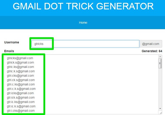 Si vous aimez Gmail dot trick et souhaitez l'utiliser pour créer un nombre illimité de comptes, vous aimerez peut-être également en savoir plus sur les générateurs de points Gmail. Il s'agit d'outils en ligne qui vous permettent de créer une variante de points de votre adresse Gmail afin que vous n'ayez pas à effectuer de travail supplémentaire. Vous pouvez consulterGénérateur de trucs de points Gmailce qui devrait bien fonctionner. Pour le[email protégé]adresse e-mail, il a généré jusqu'à 2048 versions de points.