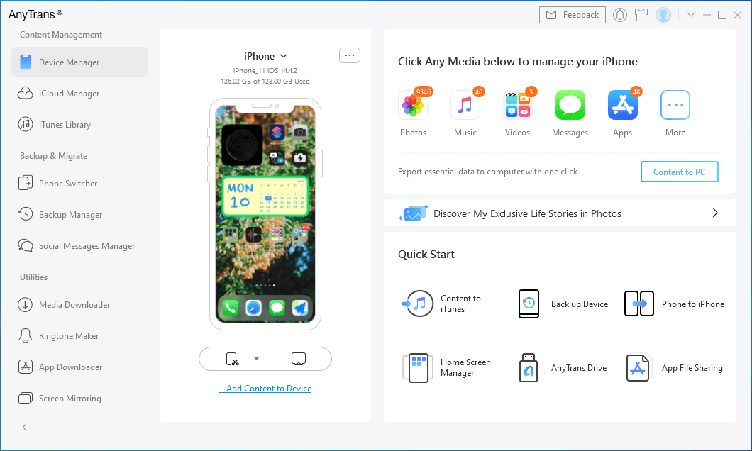 AnyTrans est un gestionnaire de données efficace iOS/iPadOS. Si vous devez nettoyer le stockage de l'iPhone, sauvegarder des fichiers multimédias ou éditer et enregistrer des vidéos iPhone sur un ordinateur, AnyTrans peut vous faire gagner beaucoup de temps.