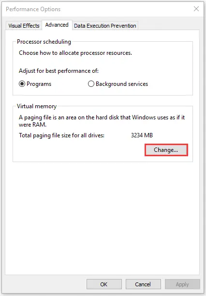 Étape 3 : Cliquez sur l'onglet Avancé suivi d'un clic sur la zone Paramètres sous Performances.