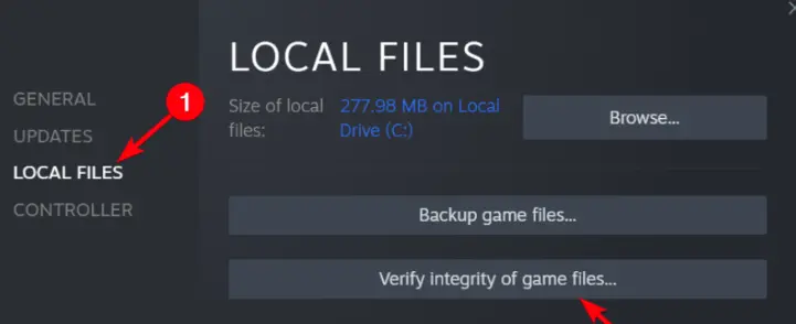 Étape 3 : Accédez à la section Fichiers locaux et cliquez sur le boutonVérifier l'intégrité des fichiers du jeu…bouton.