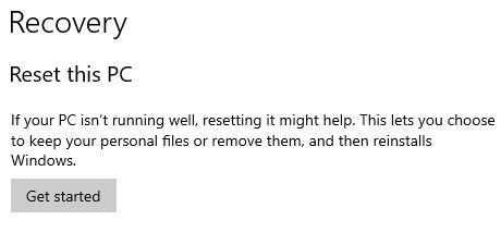 La réinitialisation d'usine de votre ordinateur effacera tout, mais vous pouvez choisir de conserver vos fichiers.3) Cliquez sur «Récupération» et sélectionnez «Commencer" en dessous du "Réinitialiser ce PConglet ".