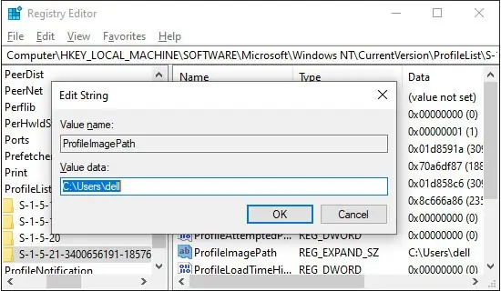 - Klik dua kali pada entri registri yang dipilih dan ubah nama pengguna sebelumnya menjadi yang baru di Data nilai. Hati-hati saat mengganti nilainya.