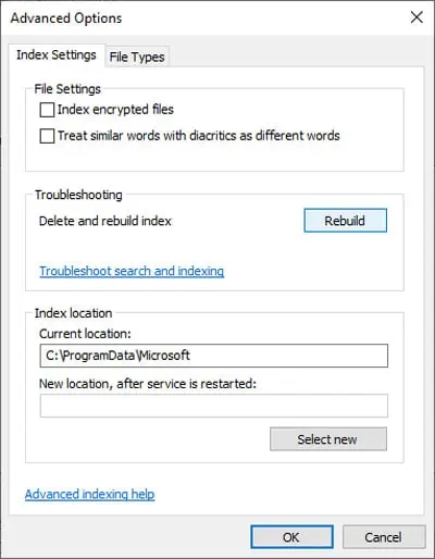 control srchadmin.dll. Ini akan mengarahkan Anda keOpsi Pengindeksan. - KlikCanggihdan pilihMembangun kembali.