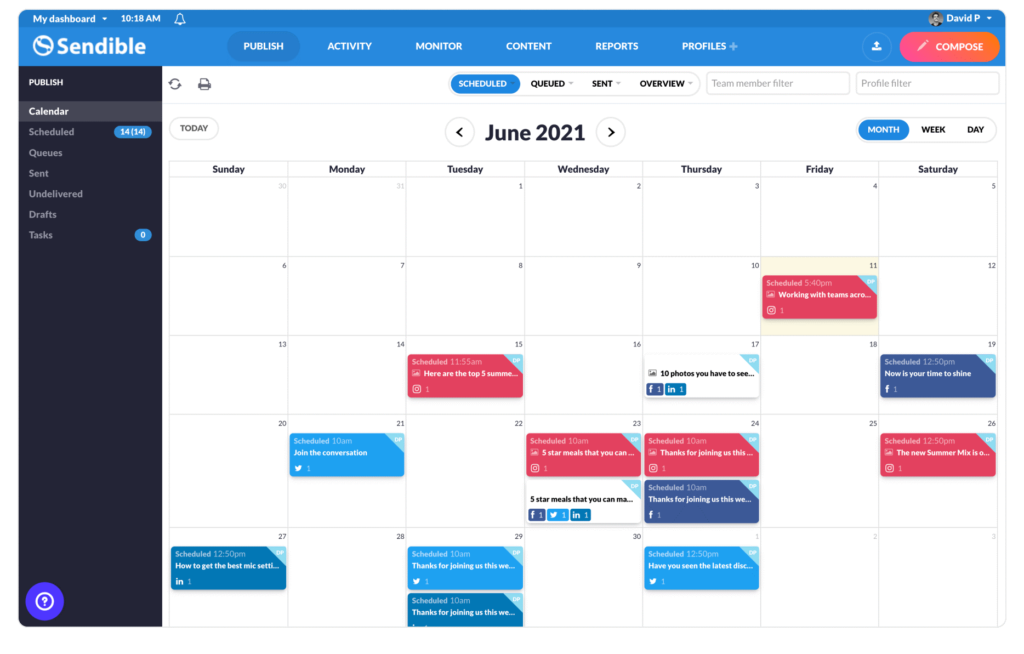 Sendible è uno strumento di gestione dei social media intuitivo che ti aiutasupervisiona tutti i tuoi account sui social media da un'unica dashboard. Supporta piattaforme come Instagram, Facebook, LinkedIn, X (ex Twitter), TikTok, Profilo aziendale di Google e YouTube, consentendoti di pianificare e pubblicare contenuti senza problemi su più canali.