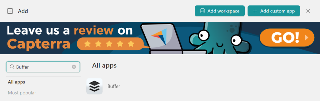 - Fare clic su "Aggiungi un'app o un'area di lavoro" nella scheda principale o nell'area di lavoro.