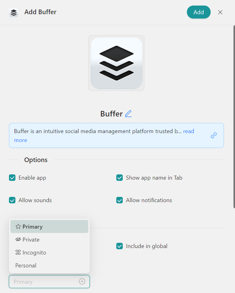 - Configurare le impostazioni dell'applicazionea tuo piacimento. Puoi scegliere un profilo per l'app (eredita dall'area di lavoro, primario, privato, in incognito o personalizzato).