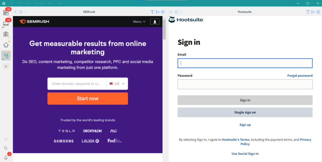 Vuoi utilizzare Semrush e Hootsuite contemporaneamente per ricercare parole chiave e tendenze durante la pianificazione dei contenuti? Rambox ti consente di farlo facilmente. Personalizza il tuo spazio di lavoro conviste delle tessere regolabili—scegli la disposizione orizzontale o verticale per mantenere più app aperte e visibili contemporaneamente.