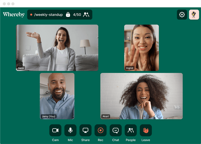 Con un solo clic, gli utenti possono partecipare alle riunioni utilizzando Whereby, un software di videoconferenza di base. Con stanze personalizzabili e reazioni emoji in tempo reale per discussioni più interessanti, offre un metodo semplice di collaborazione remota. La piattaforma è ideale per sessioni remote produttive con la sua funzionalità di condivisione dello schermo.