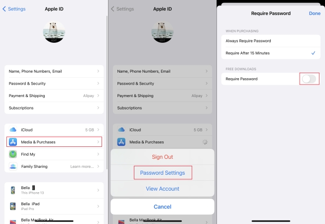 Passaggio 2.Tocca il tuoNome ID Apple > Media e acquistie scegliImpostazioni della password.