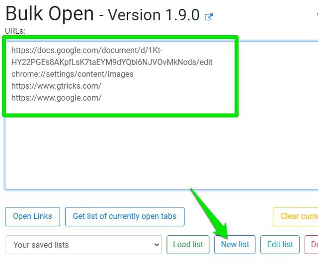 Per creare un elenco, aggiungi i tuoi URL per riga nella casella di testo e fai clic su“Nuovo elenco”pulsante in basso. Nella pagina successiva puoi dare un nome all'elenco e salvarlo.