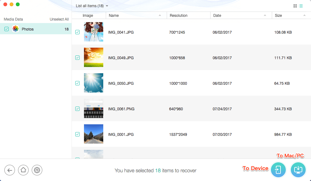 Passaggio 3.Visualizza l'anteprima delle foto eliminate > Seleziona le foto > Fai clicAl dispositivo/Computerpulsante per recuperare le foto selezionate.