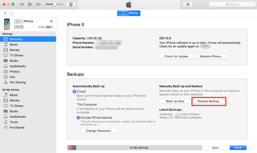 iTunes è una buona scelta per gli utenti iOS per eseguire il backup. Puoi verificare se hai già eseguito il backup delle foto cancellate del tuo iPhone su iTunes prima di perderle. Se lo hai fatto, puoi recuperare le foto cancellate definitivamente su iPhone utilizzando il backup di iTunes. Controlla i passaggi seguenti: