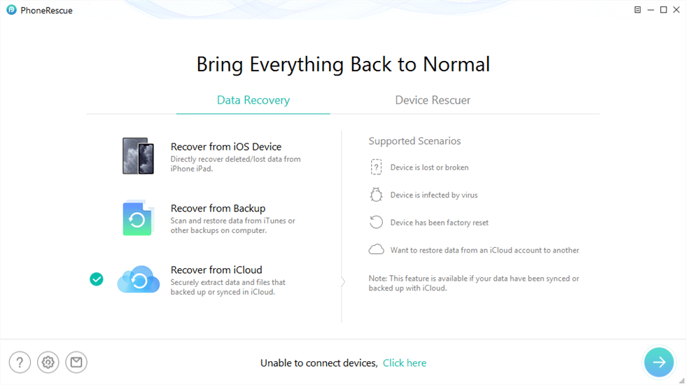 Passaggio 1.Scarica PhoneRescue per iOS ed eseguilo sul tuo computer > Collega il tuo iPhone con un cavo USB. Scegli Ripristina da dispositivo iOS e continua. Ti consente di recuperare direttamente i dati persi da iPhone e iPad.