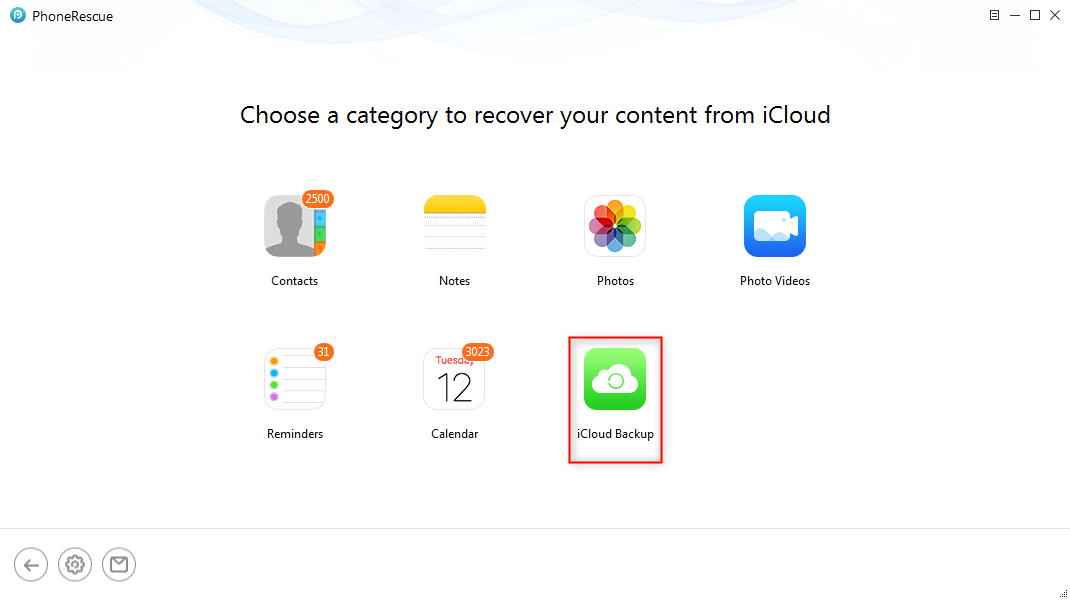 Inoltre, Phonerescue per iOS ti consente di visualizzare in anteprima le foto dal backup di iTunes o dal backup di iCloud, così puoi scegliere di recuperare ciò di cui hai bisogno. Ad esempio, se hai il backup di iCloud, puoi connettere il tuo iPhone e scegliere Ripristina da iCloud come di seguito: