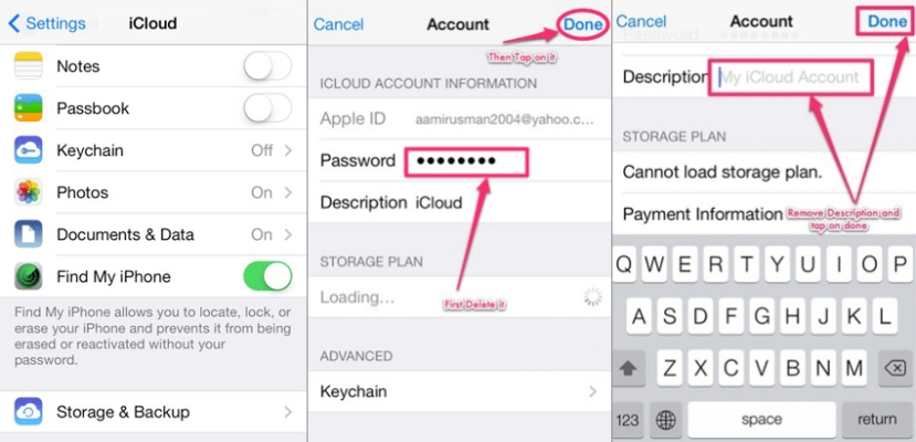 Passaggio 4.Tornerai alle impostazioni di iCloud. Tocca ilAccountsezione, quindi accedere alla sezioneDescrizionecampo e cancellarne il contenuto.