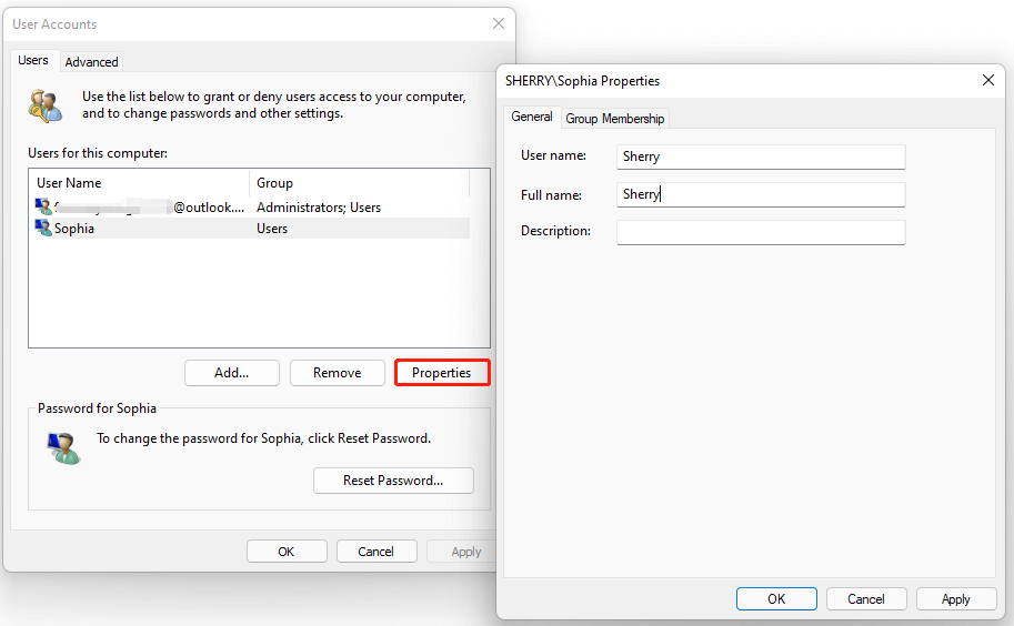 Passaggio 4. Nella finestra "Account utente", seleziona l'account utente specifico il cui nome utente deve essere modificato. Fare clic su "Proprietà".