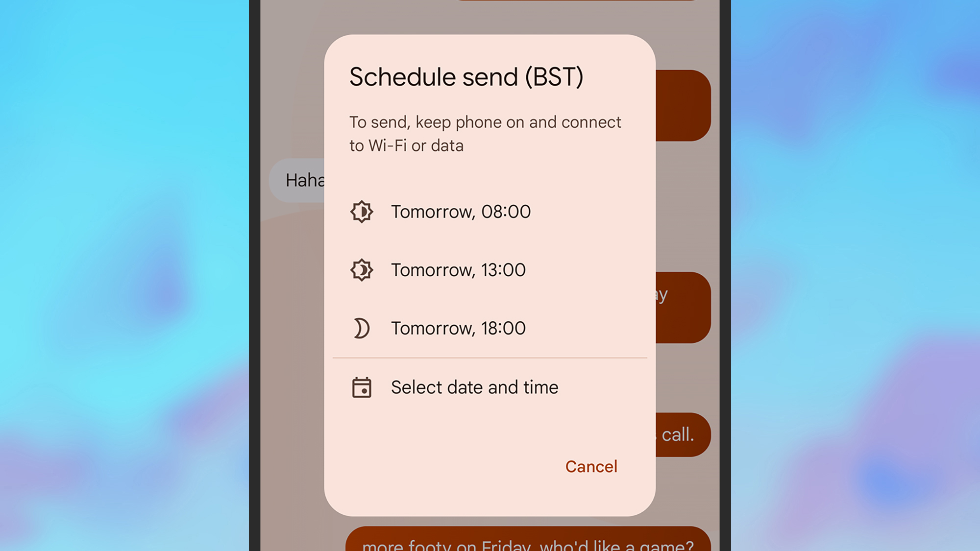 Non è necessario inviare messaggi immediatamente. Schermata: GoogleNon è necessario che tu voglia sempre inviare un messaggio immediatamente e Google Messaggi ti consente di pianificarne la consegna in un secondo momento. Dopo aver scritto il testo, tieni premuto il pulsante di invio sulla destra, quindi fai la tua scelta dalla finestra di dialogo che si apre.