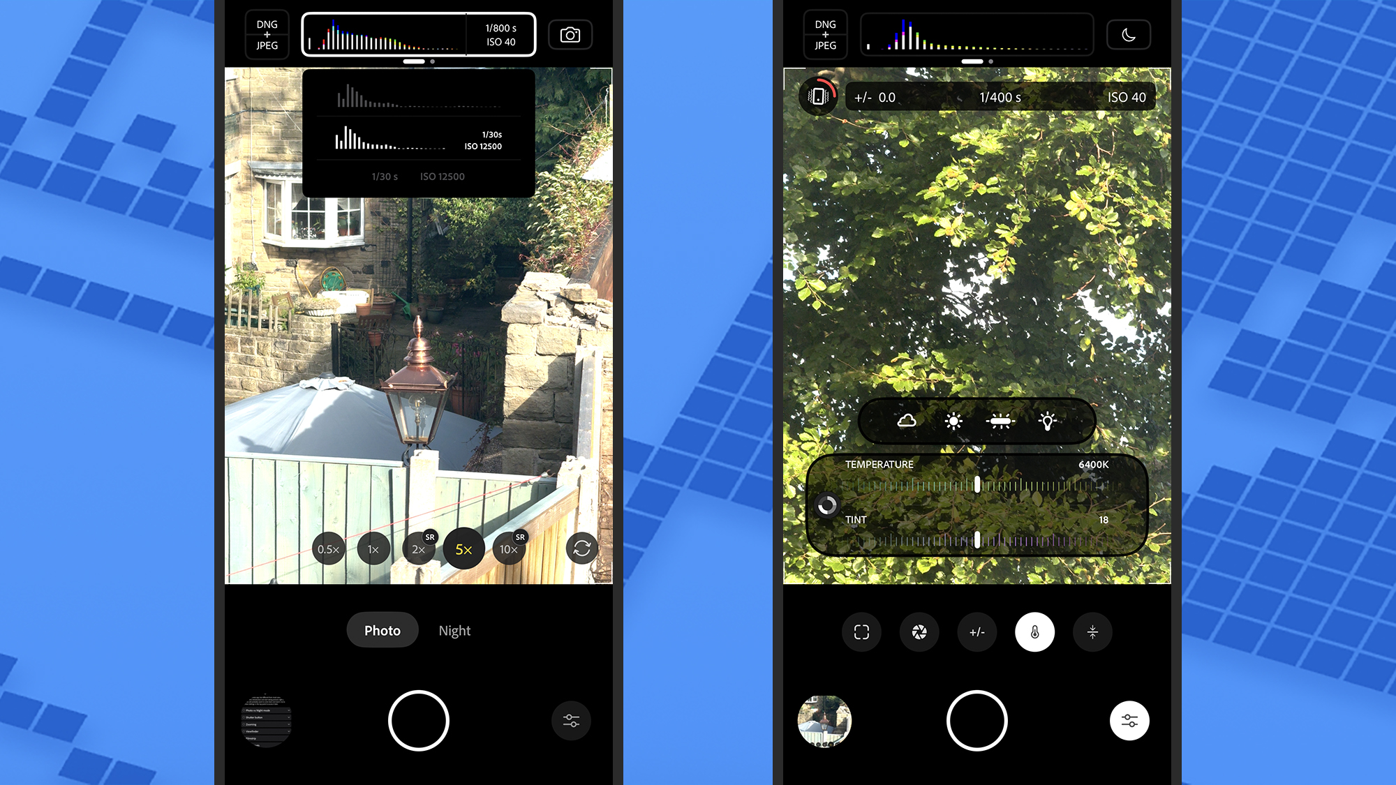 L'app offre numerose modalità e visualizza molte informazioni sullo schermo. Schermata: AdobeNell'angolo in alto a sinistra, puoi scegliere se acquisire solo immagini JPEG o immagini JPEG insieme a immagini RAW (DNG). In alto c'è un istogramma che mostra gli attuali livelli di luminosità del fotogramma nello scatto e puoi scorrere verso sinistra per accedere a una selezione di strumenti chiave, tra cui il timer della fotocamera e la sovrapposizione della griglia.