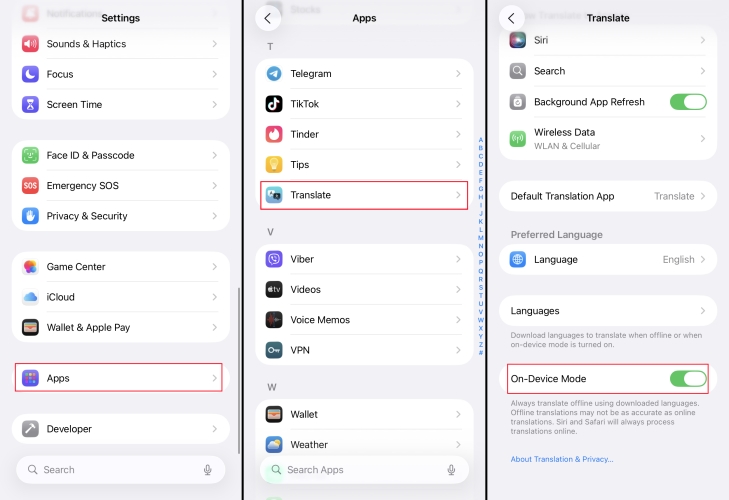 - Tutela della privacy:Il processo di traduzione viene completato localmente sul dispositivo utilizzando Apple Intelligence. Opzione per scaricare pacchetti di lingue per l'utilizzo offline.