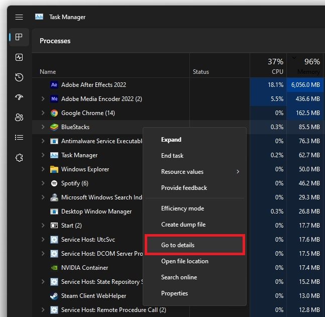 Mentre BlueStacks è in esecuzione, apri il tuo fileResponsabile delle attività. Qui, fai clic con il pulsante destro del mouse suBluestackselaborare e selezionareVai ai dettagli.