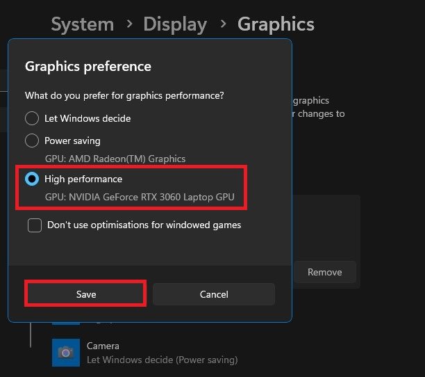 Dopo aver aggiunto l'app, fare clic suOpzionie assicurati di impostare il filePreferenza graficaAAlte prestazioni. Ciò assicurerà che la tua scheda grafica venga utilizzata quando necessario rispetto ad altri processi che potrebbero richiedere anche l'esecuzione della tua GPU.