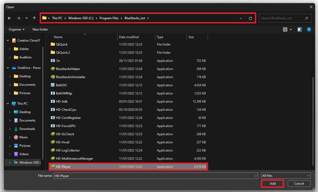Nel tuo Esplora file, vai all'unità su cui hai installato Bluestacks, Programmi, BlueStacks e in questa cartella, individua e aggiungi il fileLettore HDapplicazione.