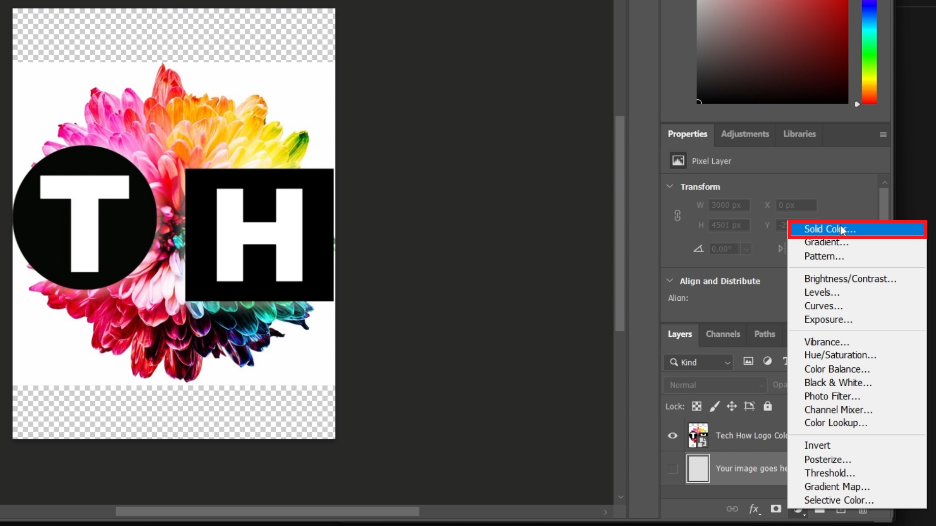 Seleziona il livello pertinente e fai clic su "Tinta unita" per cambiarne il colore.
