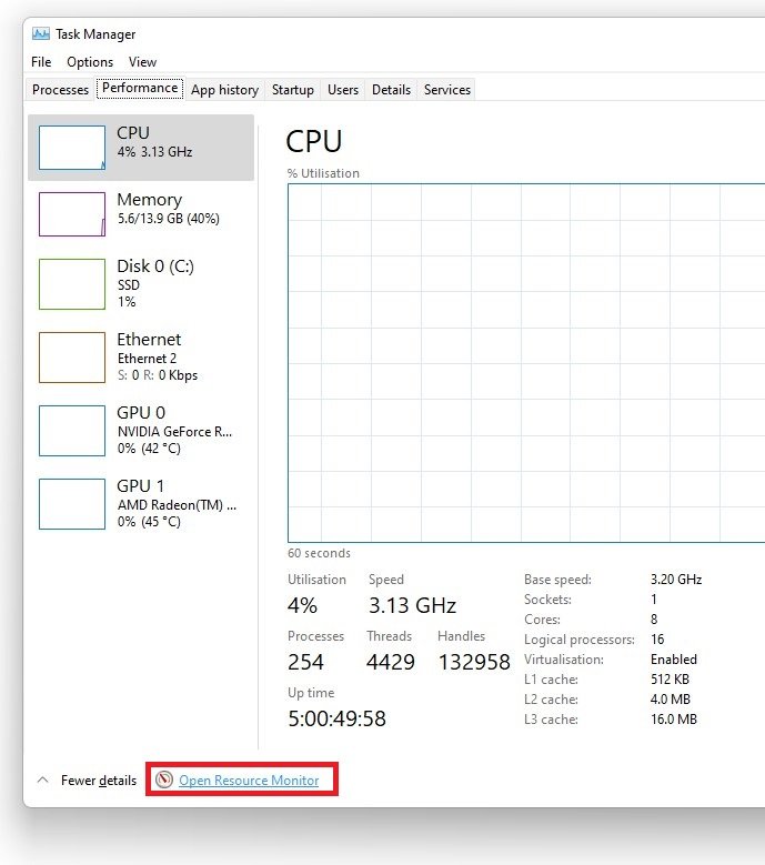 Apri il tuoResponsabile delle attivitàcercandolo nella ricerca del menu Start. NelPrestazionescheda, fare clic suApri Monitoraggio risorse.
