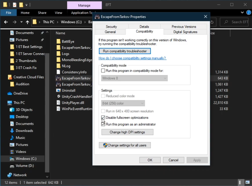 Fare clic con il tasto destro sul file EscapeFromTarkov.exe e selezionare Proprietà dal menu contestuale. Vai alla scheda Compatibilità, dove troverai un paio di impostazioni importanti da modificare. Assicurati che la casella di controllo "Disabilita ottimizzazioni a schermo intero" sia selezionata, che può aiutare a prevenire arresti anomali e migliorare le prestazioni generali. Inoltre, abilita l'opzione "Esegui questo programma come amministratore", che garantisce all'applicazione privilegi elevati e può risolvere potenziali problemi relativi all'accesso e alle autorizzazioni. Non dimenticare di fare clic sul pulsante Applica per salvare queste modifiche e sarai pronto per goderti un'esperienza Escape From Tarkov più stabile.
