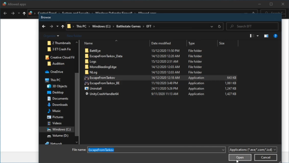 Selezionare perModificaimpostazioni e poiConsenti un'altra app. SelezionareSfogliae il tuo esplora file si aprirà. Passa all'unità su cui hai salvato il gioco, seleziona Battlestate Games, EFT. Qui seleziona l'applicazione Escape from Tarkov e fai clic su Apri.