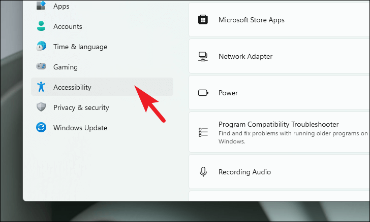 Passaggio 1.Vai aMenù di avvioe fare clic suImpostazioniicona. Quindi, seleziona ilAccessibilitàscheda dalla barra laterale sinistra.