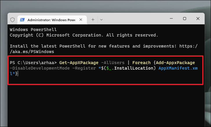 Passaggio 2.Digita o fai copia+incolla il seguente comando e premi Invio:Get-AppXPackage -AllUsers | Foreach {Add-AppxPackage -DisableDevelopmentMode -Register “$($_.InstallLocation) AppXManifest.xml”}
