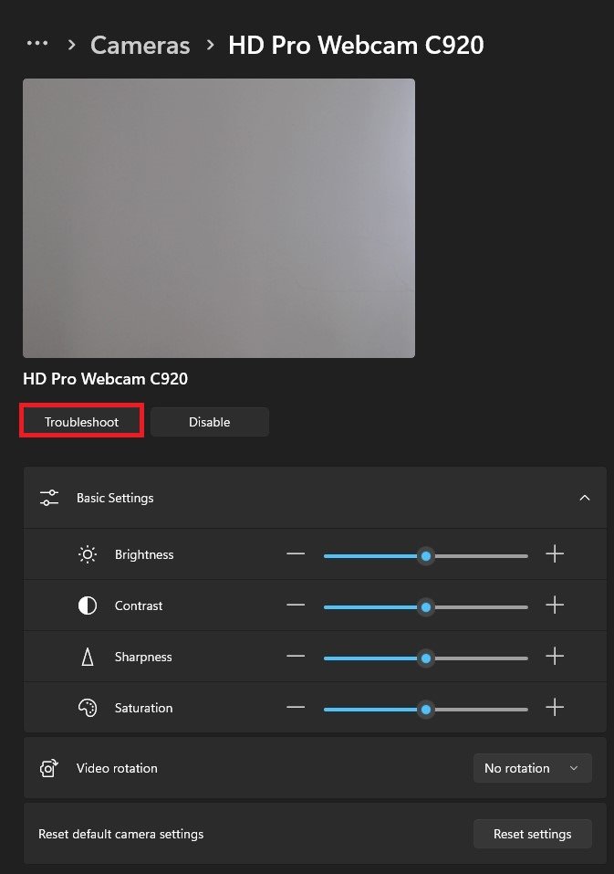 Quando selezioni la tua fotocamera, puoi andare avanti e visualizzare in anteprima l'output video e modificare alcune impostazioni di base di seguito per la maggior parte delle webcam connesse. Puoi anche risolvere i problemi software comuni per la fotocamera connessa.