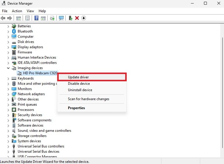 Quindi, espandi il tuoFotocamere, o in alcuni casi, si chiamaDispositivi per l'immagine. Fai clic con il pulsante destro del mouse sulla fotocamera e selezionaAggiorna driver,e infine selezionaCerca automaticamente i conducenti. Ci vorrà del tempo per garantire che il driver della fotocamera sia aggiornato.