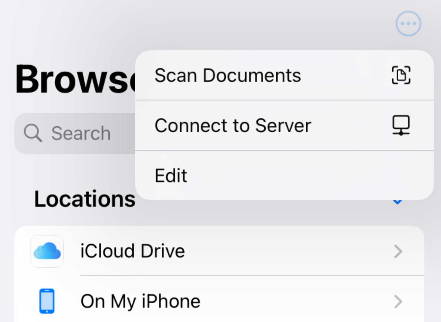 Se hai già cartelle condivise sulla tua rete, puoi connetterti ad esse nell'app File, preinstallata sul tuo iPhone e iPad. Tocca il menu a tre punti nell'angolo in alto a destra del tuo iPhone; lo stesso pulsante si trova nell'angolo in alto a destra della barra laterale sinistra del tuo iPad. RubinettoConnetti al server.